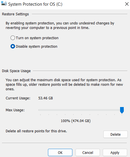 - Click Delete to delete all restore points